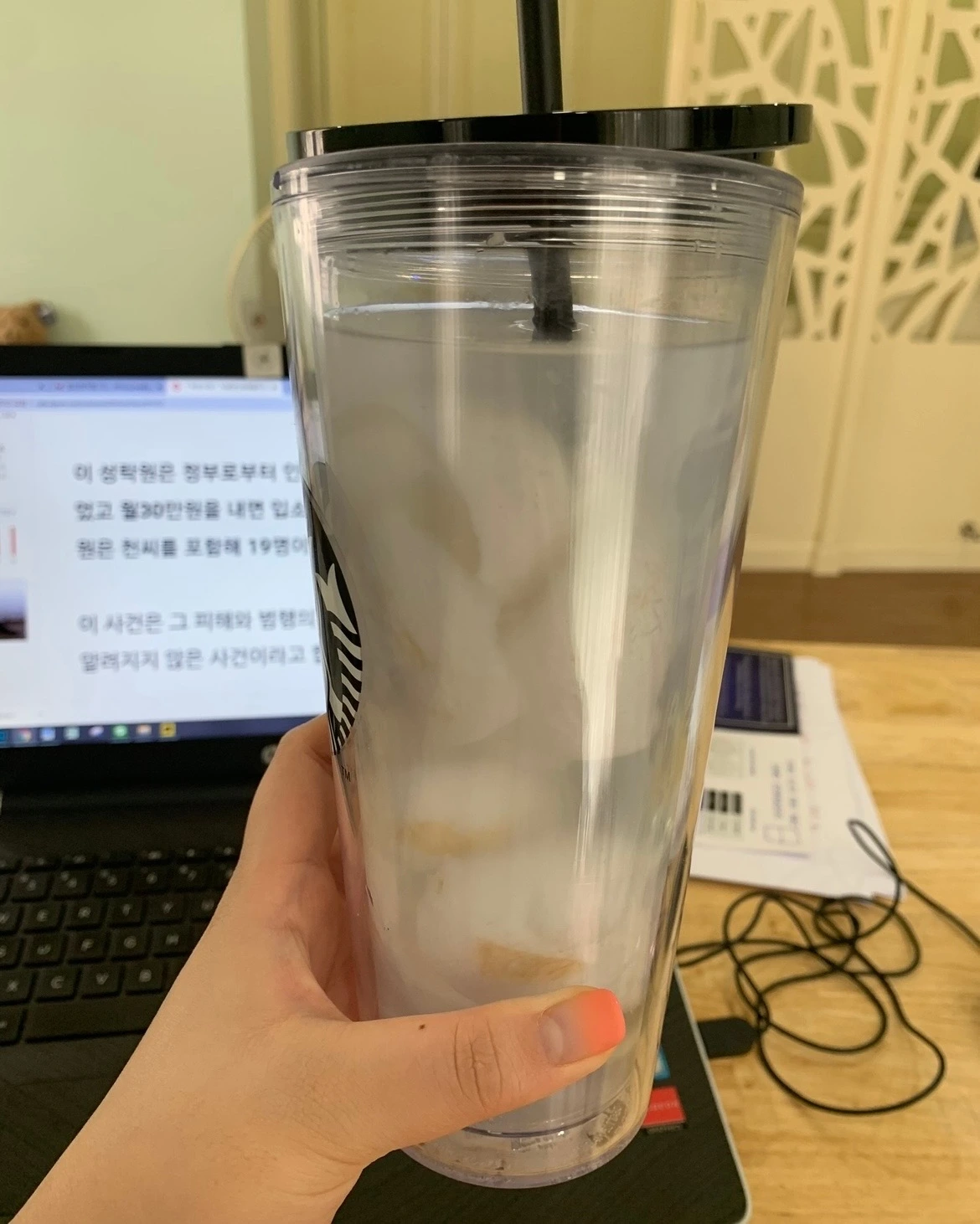 3. 그걸 코코넛 워터가 담긴 텀블러에 넣는다.