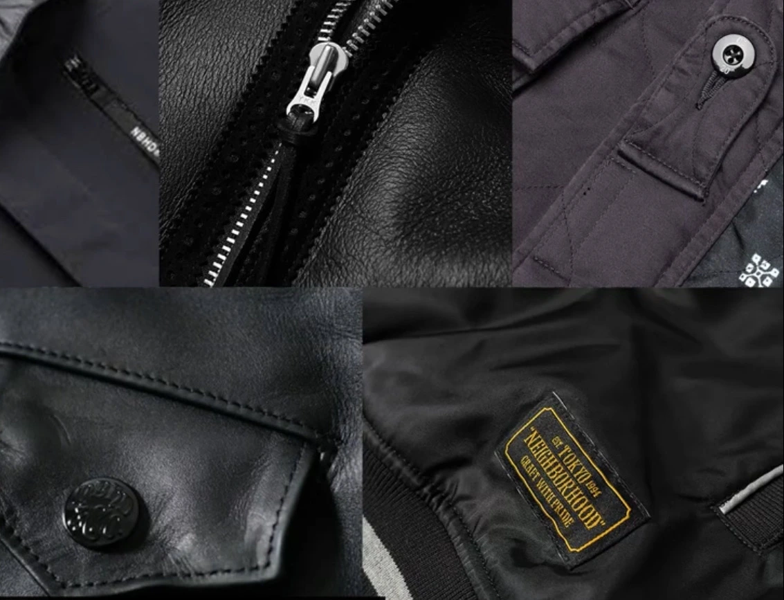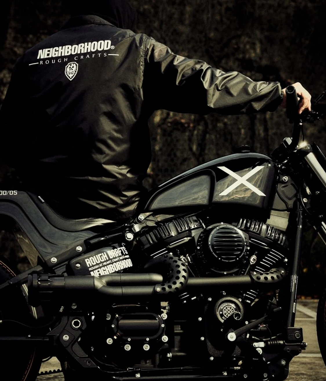 네이버후드는 변색되거나 손상된 제품을 리폼한 데님이나 작업복에서 영감을 받아 워크웨어와 밀리터리웨어 스타일에 스트릿한 무드를 추가한 의류들을 시그니처로 론칭을 하기 시작했는데요. 이중에서도 네이버후드 하면 떠올리는 컬러는 역시 블랙이었습니다. 신스케에 말에따르면 블랙이라는 컬러가 사람들로 하여금 색감보다는 디자인에 집중을 할 수 있게 해주고, 소재마다 다른 텍스쳐와 부자재들의 디테일을 더 돋보이게 해준다는 이유였는데요. 다른 이야기로는 비만 체형이었던 신스케가 옷을 입었을때 날씬해 보이기위해 블랙컬러의 의류를 주로 입으면서 블랙에대한 사랑이 커졋다고도 합니다.