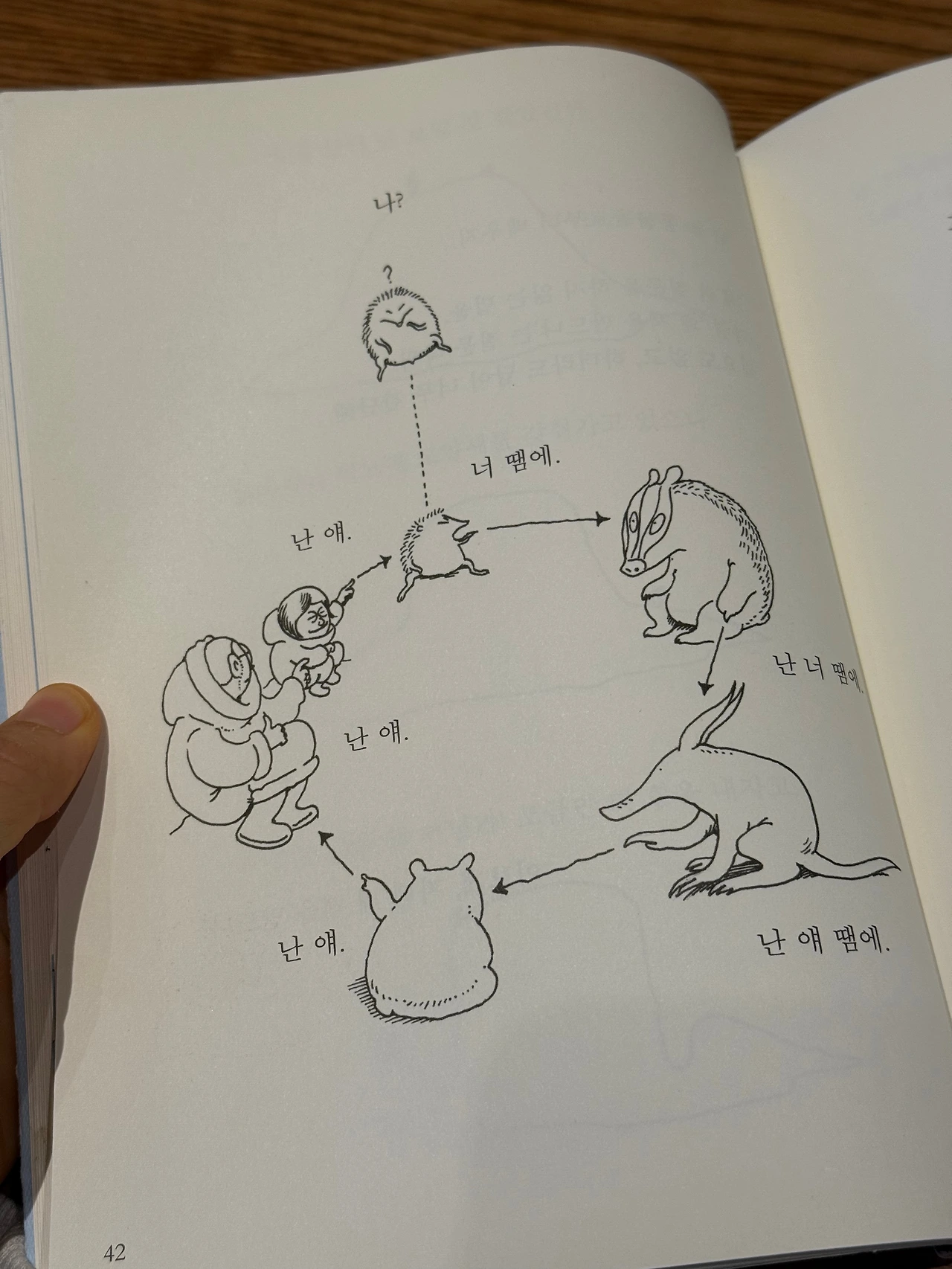 왜라는 질문에 답을 할게 아니라, 왜라는 질문을 하지 않는 방법을 알려준다. 책을 만드는 동물들은 저마다를 가리키며 자기 존재 이유를 말한다. 서로가 서로를 위해 일하고 그들은 큰 원으로 하나가 된다. 그렇다. 왜 사느냐에 대한 답은 내게 없었다. 네게 있었다. 딸에게 김치 가져다주는 맛에 사는 순덕이, 취업에 도움 될 거란 선배의 말에 혹해 100대 명산 등산에 도전한 지은이, 글쓰기가 삶에 도움이 될 거라는 유투버의 말에 매주 어떻게든 글을 쓰는 나까지. 너 때문에 하고 있고 너 때문에 살고 있다.