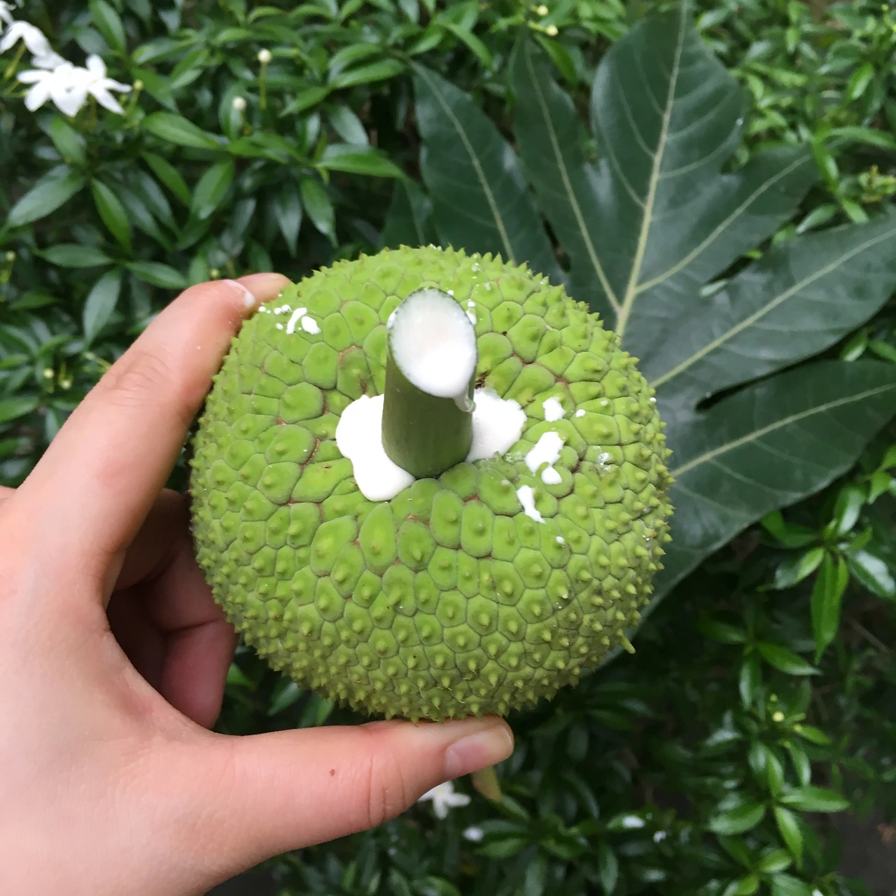 호기심에 집 앞에 있는 빵나무 열매를 잘라봤는데, 자르자마자 하얀색의 끈적한 수액이 흘러나왔다. 이 수액은 본드나 고무의 원료로 사용되기도 한다고 한다. 실제로 브레드프루트는 탄수화물 함량이 높아 열대 지방에서 중요한 식량 자원으로 활용되고 있다. 케이크나 쿠키 등 다양한 요리에 사용되며, 그 활용도가 높다.