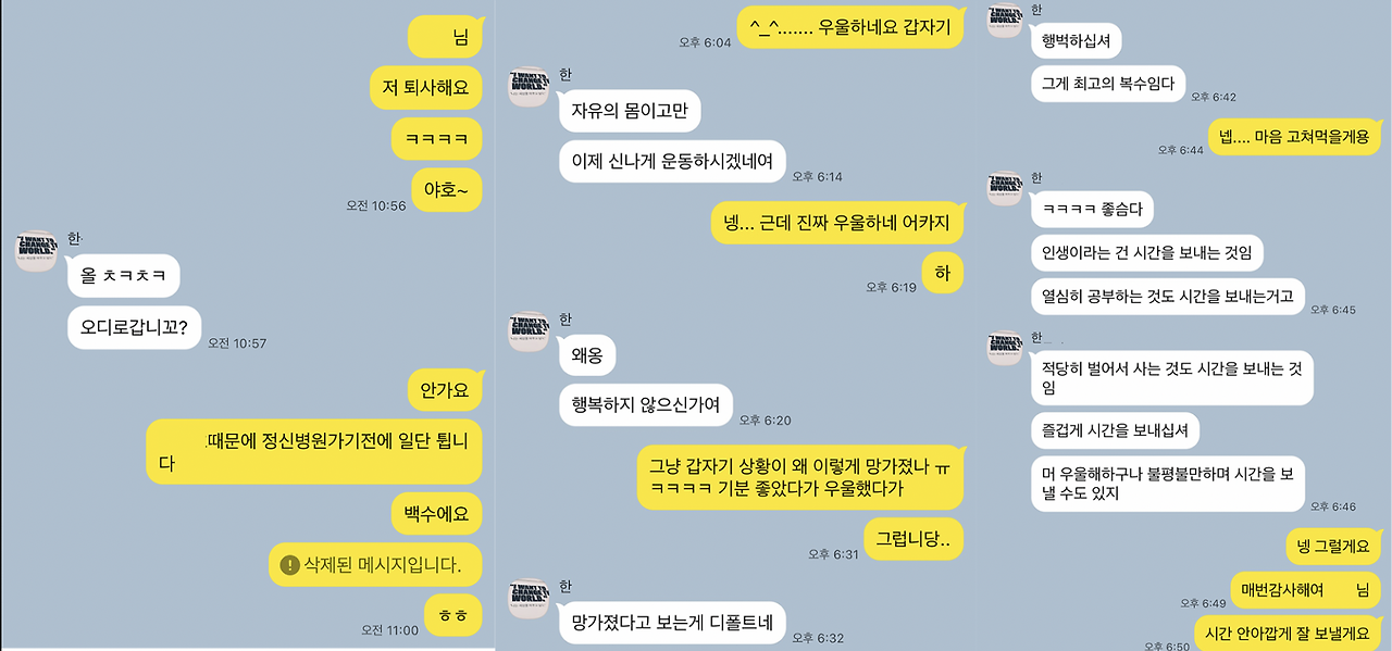 선생님은 한참을 내 얘기를 들으셨다. 며칠 전의 이야기와 지난 3년 동안 내가 겪었던 일들을 이야기했다. “리엠씨가 진짜 원하는게 뭐에요?” 선생님이 질문하셨다. “그냥… 빨리 이 상황에서 벗어나고 싶어요. 퇴사일이 빨리 오면 좋겠어요”라고 대답했다. 다시 선생님은 나와 한참 이야기를 나누었다. 그리고 선생님은 다시 물어보셨다.