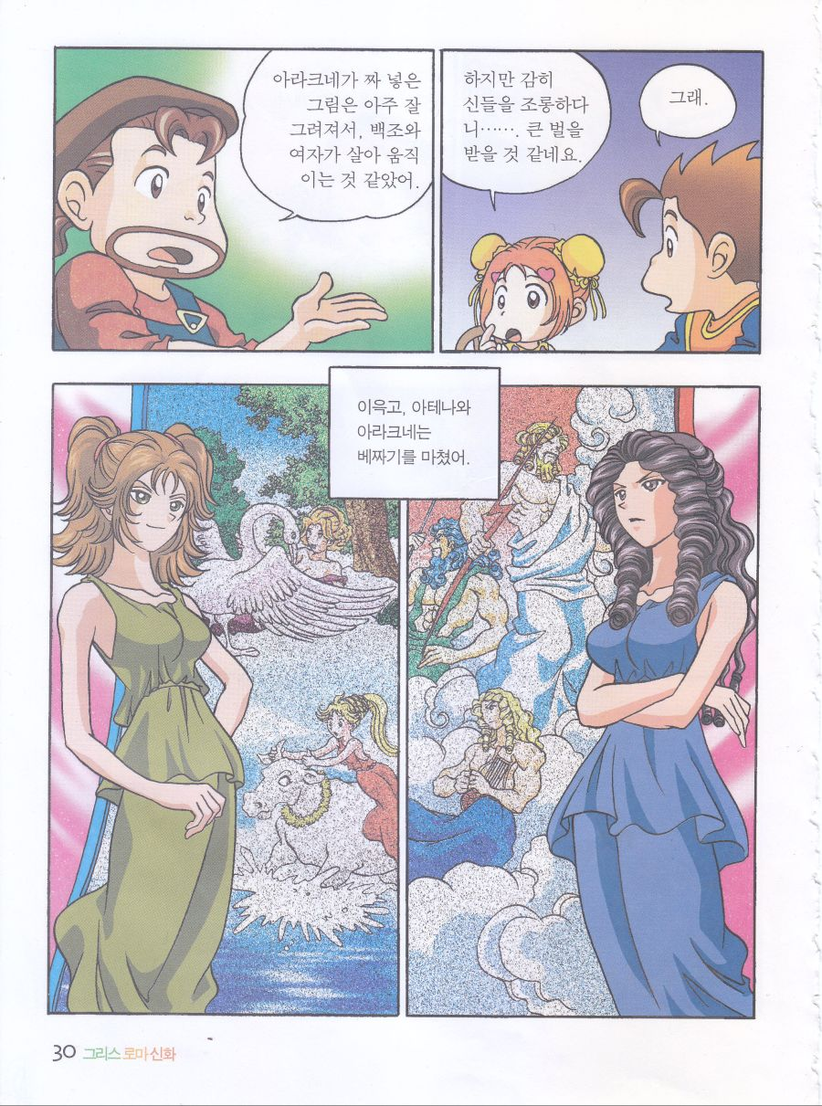 하지만 다시 생각해 보면, 아라크네는 신이라는 절대적인 존재와 순수 실력만으로 맞붙은 몇 안 되는 뛰어난 인간 중 한 명입니다. (어떠한 애니메이션에 나오는..) 화려한 눈동자 모양이나 대단한 혈통같은 것 없이도 신의 경지에 다다르는 것에 성공한 것입니다. 아라크네가 디스의 수위를 조금만 낮추었더라도, 적당히 오래 살아남아 그녀의 작품 중 일부가 후대에 전해질 수도 있지 않았을까 싶기도 하고요. (하지만 그랬다면 전설이 되지는 못했겠죠.)