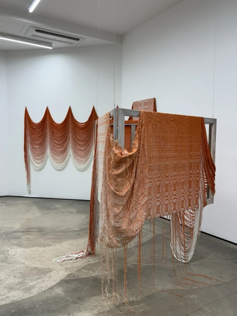 차승언 작가의 작품은 시간순으로 배치되어 있었습니다. 먼저 정해진 시스템 안에서 패턴을 구현하기 위한 규칙이 시각화된 도면이 놓이고, 순서대로 그 도면을 물리적인 실체로 만들어 낼 실과, 그 실이 엮여 만들어진 ‘의도된’ 패턴이 있습니다. 철제 프레임 위에 직물을 덧씌우면 흘러내리거나 구부러지며 자연스럽게 왜곡이 발생하게 됩니다. 그리고 그 왜곡은 의도하지 않았던, 새로운 형태를 우연히 만들어 내는 계기가 됩니다. 왜곡이 해소되며 다시 본연의 패턴으로 돌아가고, 짜고-푸는 행위는 계속해서 반복되며 실은 엮이거나 흩어집니다. 완결되지 않는 텍스트가 끊임없이 순환하며 이어지는 것처럼 보입니다.