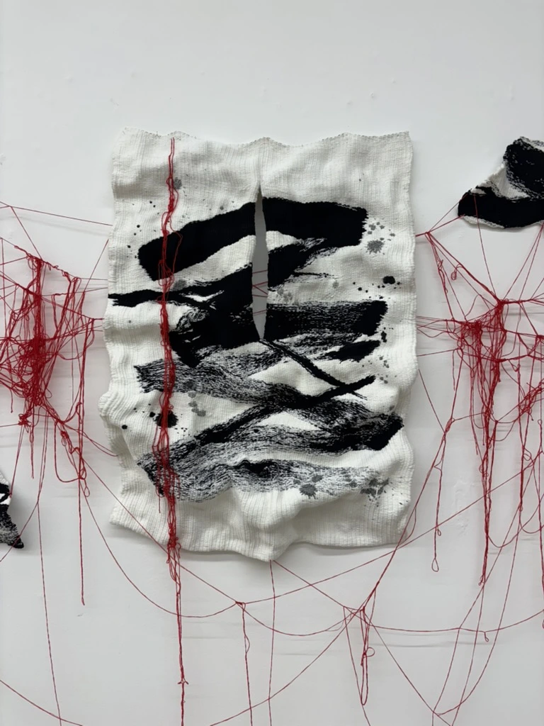 이현화 작가의 작품은 이번 전시를 통해 만난 작품들 중 가장 ‘신체’가 두드러지게 드러난다고 느꼈습니다. 사실 신체 그 자체라기보다는, 신체 혹은 움직임의 흔적이 매우 명확하게 가시화되었달까요. 이 작품 역시 먹으로 드로잉을 한 후 그 드로잉을 그대로, 아주 노동집약적이고 섬세한 방식으로 섬유로 재탄생시킨 것입니다. 드로잉이란 찰나와 우연의 미학을 담아내는 장르라고 생각하는데, 이에 시간성이 더해지니 완전히 새로운 물성을 얻은 것처럼 보입니다.