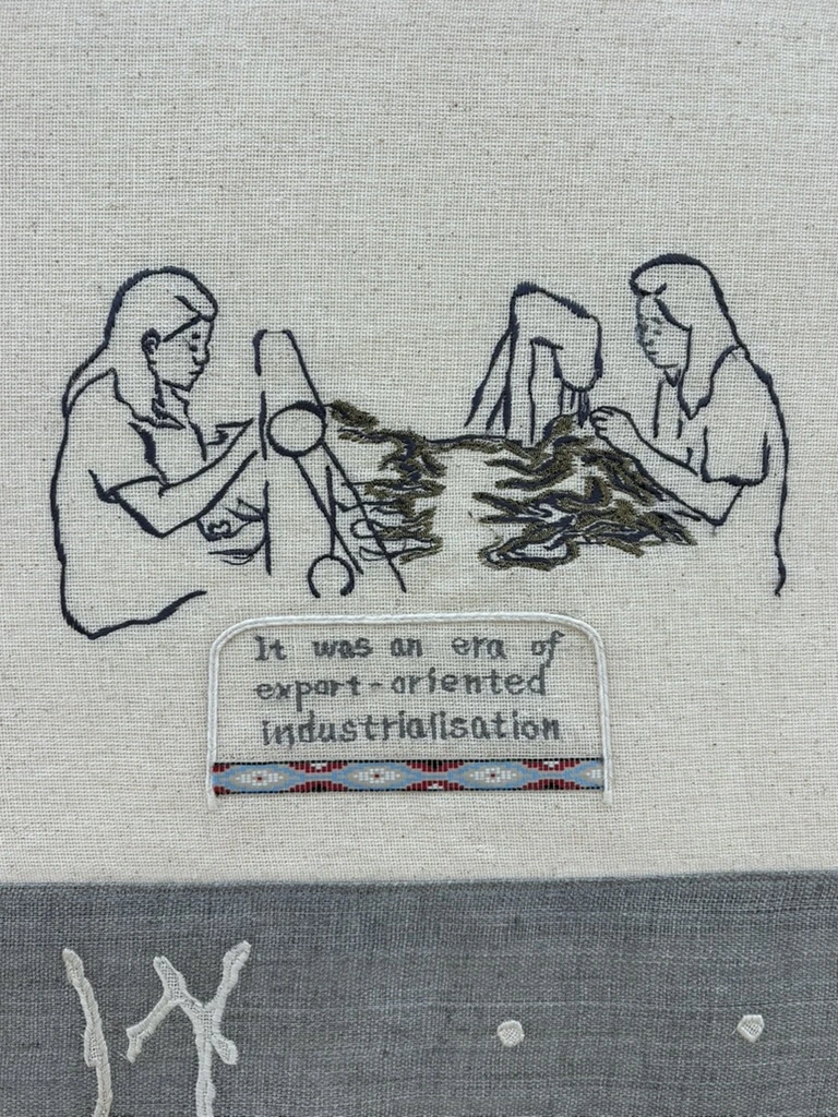 여성의 노동이 평가절하되는 것, 이 아주 오래되고 보편적인 문제를 오랜 시간 탐구한 작가가 있습니다. 2019년 MMCA 올해의 작가상 4인 중 한 명이었던 홍영인 작가는 자수와 태피스트리 작업을 통해 표현 수단을 ‘여성적’으로 전환하는 작업을 꾸준히 해 왔습니다. 산업화를 경험한 국가에 공통적으로 존재했던 여공의 저임금 노동인 바느질(미싱)과 순수예술에서 배제되었던 ‘자수 공예’의 방식으로, 침묵된 목소리를 물리적으로 시각화합니다.