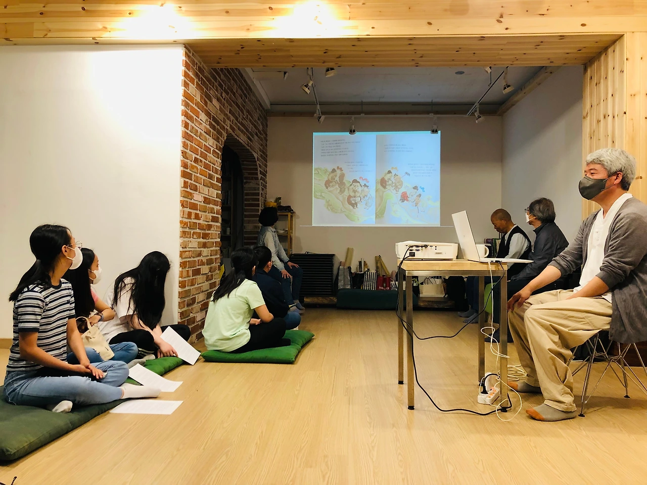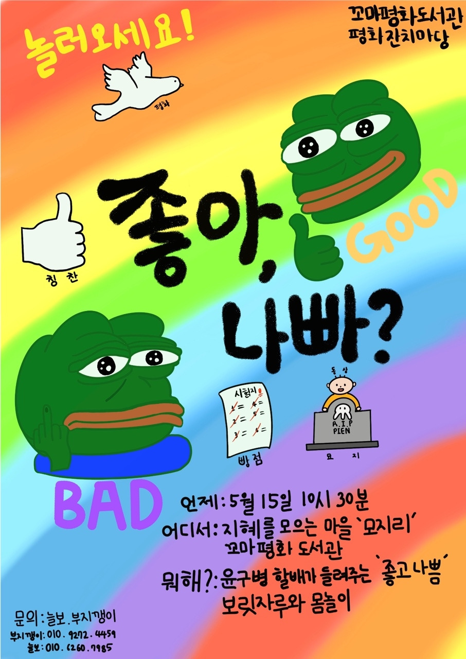 잔치마당은 꼬마평화도서관사람들 엄지 살림지이 부지깽이가 그림책 연주로 열었다. <김수한무>에 나오는 영감님은 환갑에 늦둥이를 얻어 아이에게 ‘김수한무 거북이와 두루미 삼천갑자 동방삭’이라고 지어줬다. 그러나 물에 빠져 허우적거리는데 긴 이름을 다 불러야 한다고 고집하는 아버지 때문에 죽을 고비를 넘겨야 했다. 좋다고 생각하는 것이 참으로 좋은 것인지 짚어봐야 한다는 뜻에서 부지깽이가 고른 이 책은 자연스럽게 본 꼭지 주제 ‘좋음과 나쁨’으로 넘어가도록 했다.