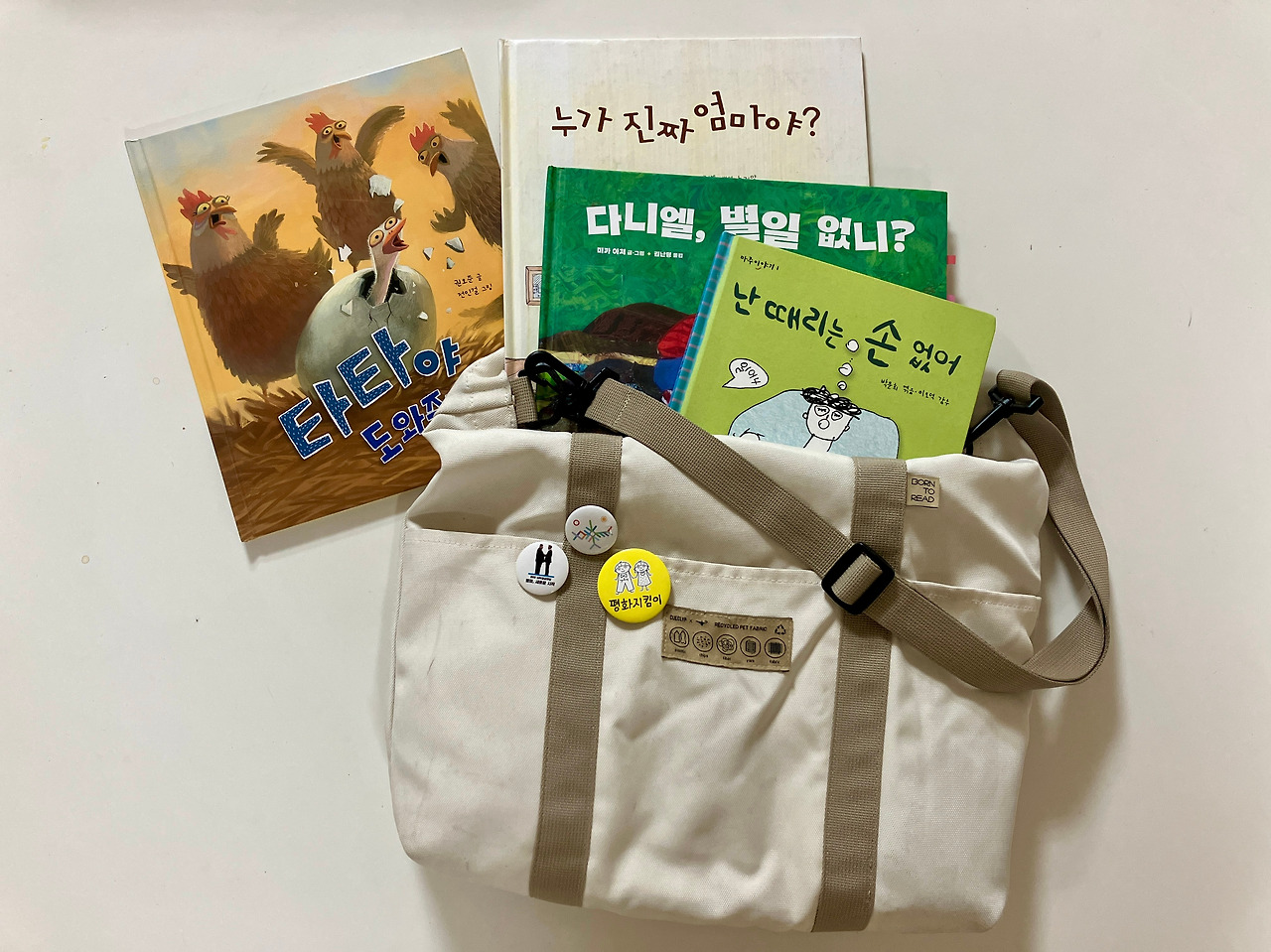 날아다니는 꼬마평화도서관은 평화가 소복한 그림책이 머무는 가방으로, 밥집이나 카페 때로는 술집이나 공원 어디에서라도 그림책 연주를 펼칠 마련이 되어 있다.