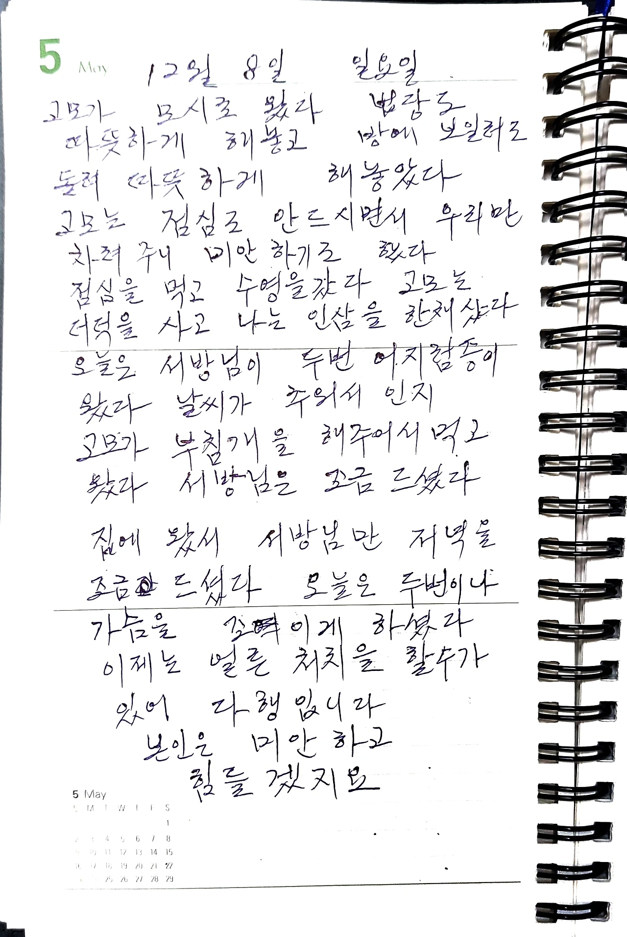 기도하고 서방님하고 국수를 삶아 먹었다. 자꾸만 안 움직이시고 잠만 주무신다. 청소만 하고 조금 쉬다 옆집 애기네 엄마 차를 타고 (집으로) 올라왔다. 오늘은 보일러 기름을 넣었다. 우리는 한 드럼 반, 고모네는 한 드럼. 마음이 뿌듯하고 좋았다.
