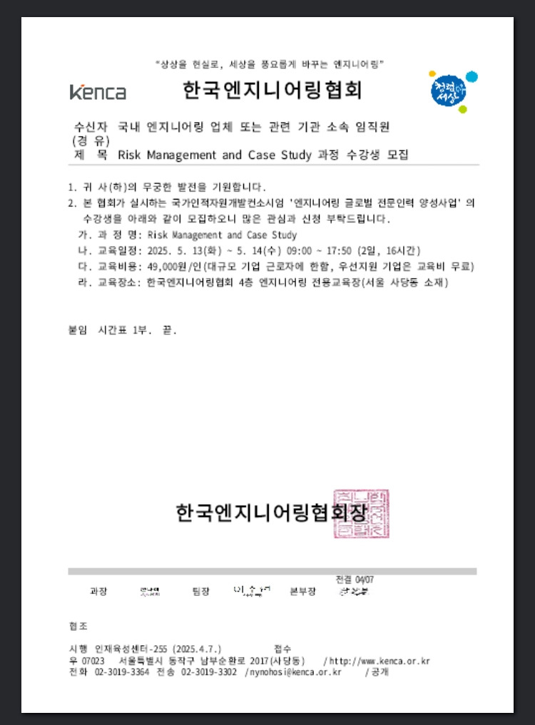 문의는 공문의 번호나 한국엔지니어링협회 담당자 전화 (02-3019-3369)로 하셔도 되고,