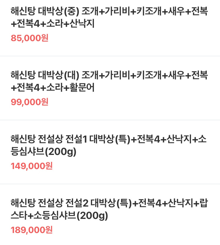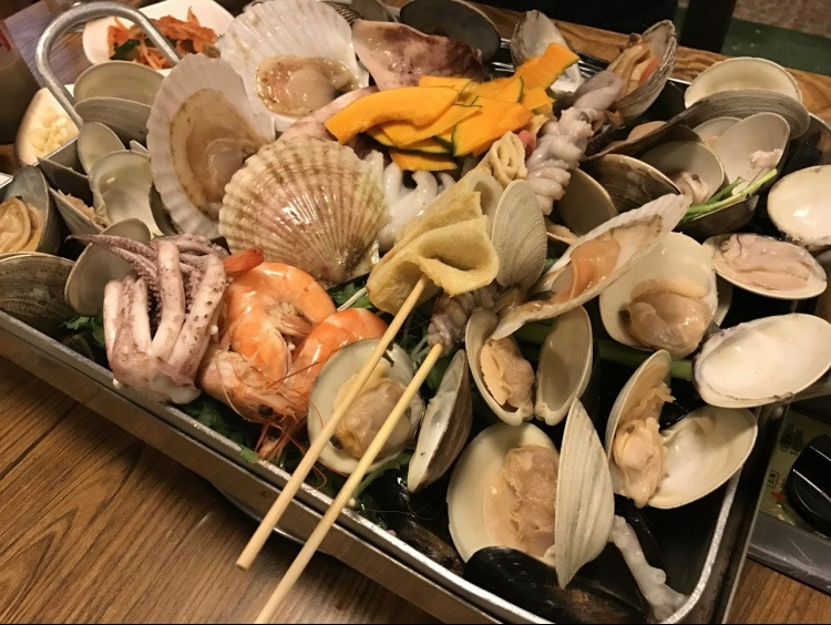 싶을 정도로 크고 긴 용기에 전복, 조개, 문어, 새우, 산낙지, 오뎅 등이 엄청난 양으로 나왔습니다.