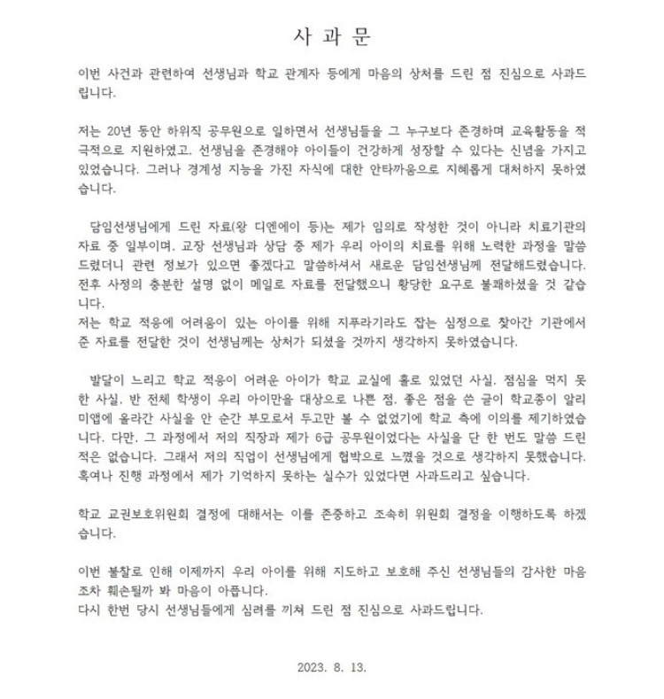 그러니, 왕의 아들을 잘못 만난 죄로 직위해제되고 검찰 조사 받던 그 선생님은 이 사과문을 보고 어떤 생각이 들까? 심하게 말하면 종이라면 찢어버렸을 것 같다.