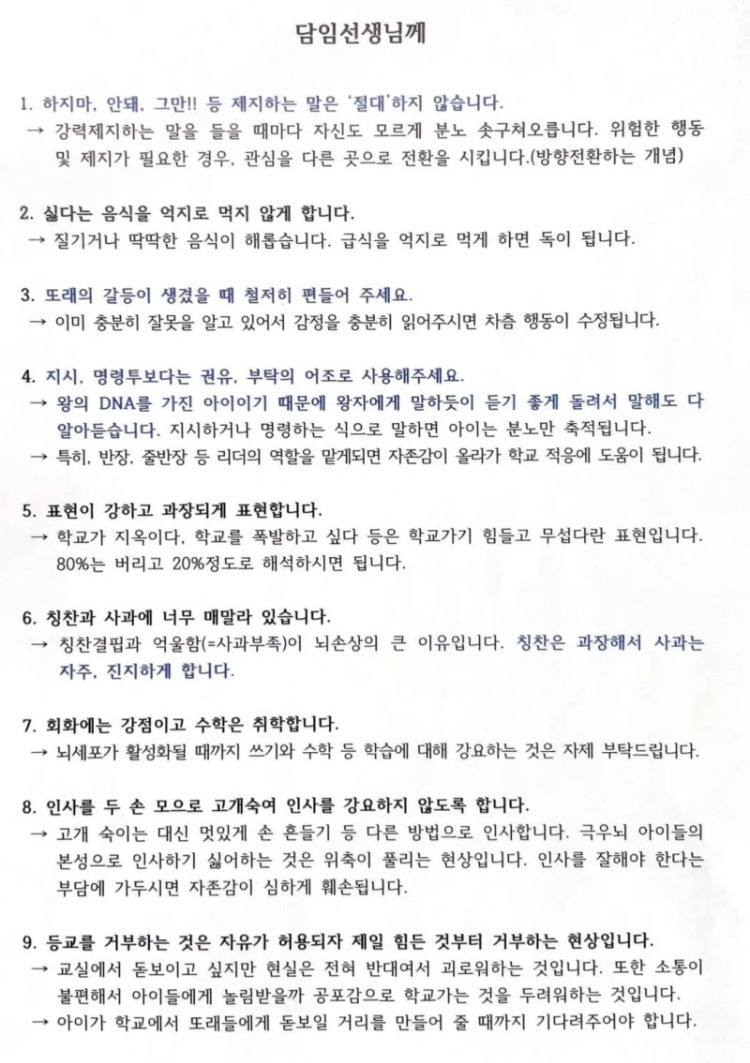 담임 선생님에게 보낸 편지를 보니, 정말 가관이었다. 이것이 과연 내 아이를 맡은 담임 선생님에게 쓴 글일까? 왕이 신하에게 지시하는 글일까 헷갈릴 지경이다.