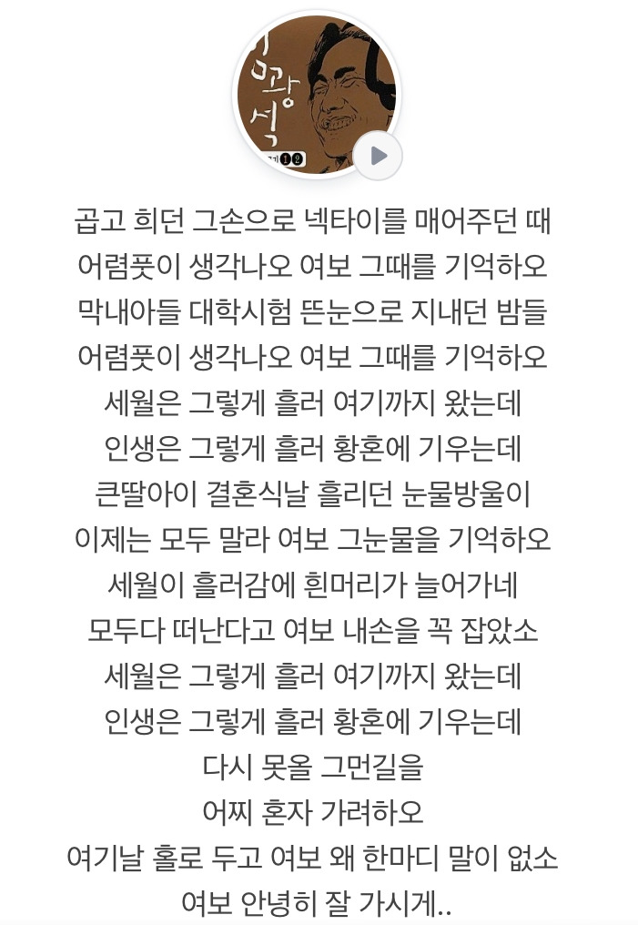 어찌 보면 너무나 평범한 노부부의 삶의 이야기를 들었을 뿐인데 왜 이렇게 감성을 건드리고 눈물이 나게 할까.