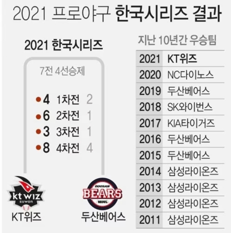 KT는 2015년 1군에 합류하고 내리 3년 꼴찌를 하면서 프로의 높은 벽을 실감했었지요. 그랬던 그 팀이 창단 8년 만에 한국 시리즈 우승을 하고, 이번에 다시 왕좌에 도전한다는 것이 대단한 것 같습니다.