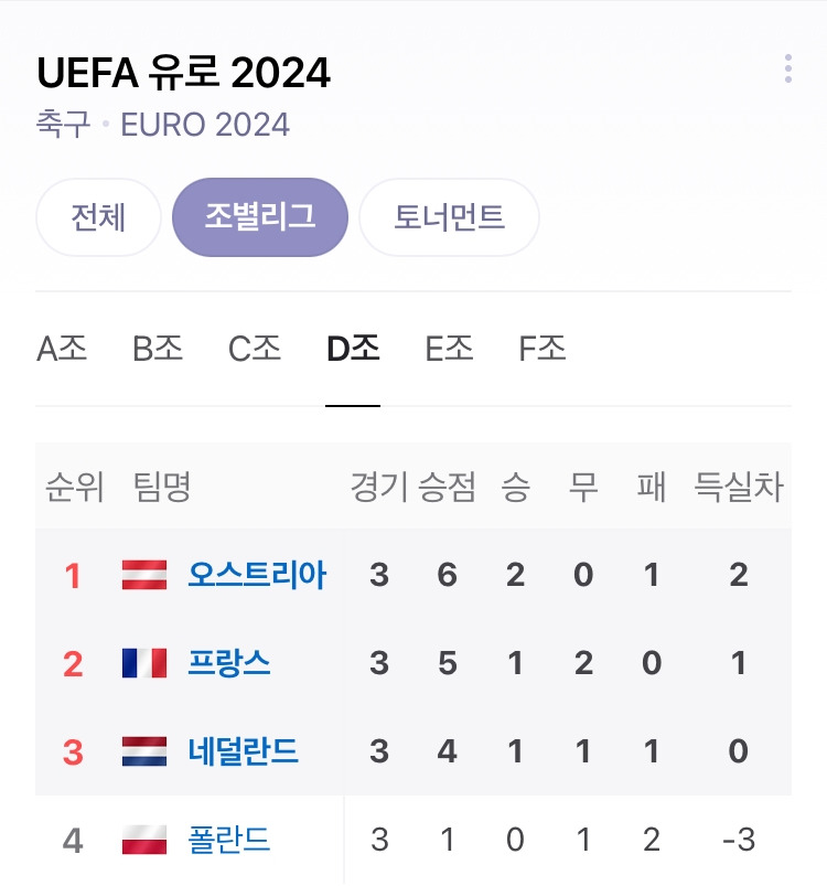 3차전에서도 오스트리아는 네덜란드의 각포와 데파이가 2골을 작렬했는데도 불구 3-2로 승리를 하며, FIFA ranking 7위 네덜란드가 3위로 겨우 토너먼트에 진출하는 굴욕을 맛보게 했습니다. 프랑스 또한 폴란드와 3차전에서 음바페와 레반도프스키가 1골씩 주고 받으며 1-1 무승부 2위로 이름값에 미치지 못하는 성적으로 토너먼트에 진출합니다.