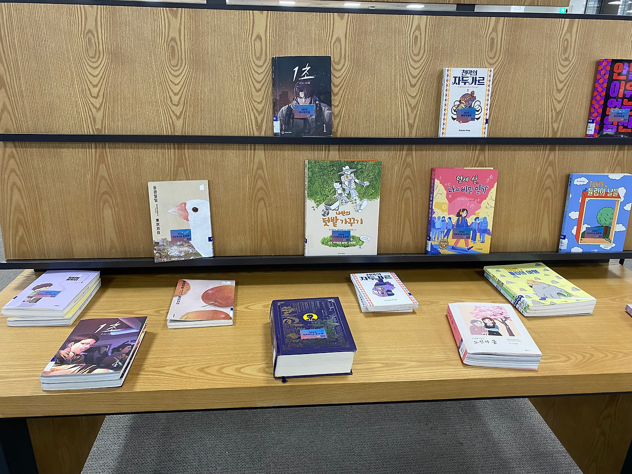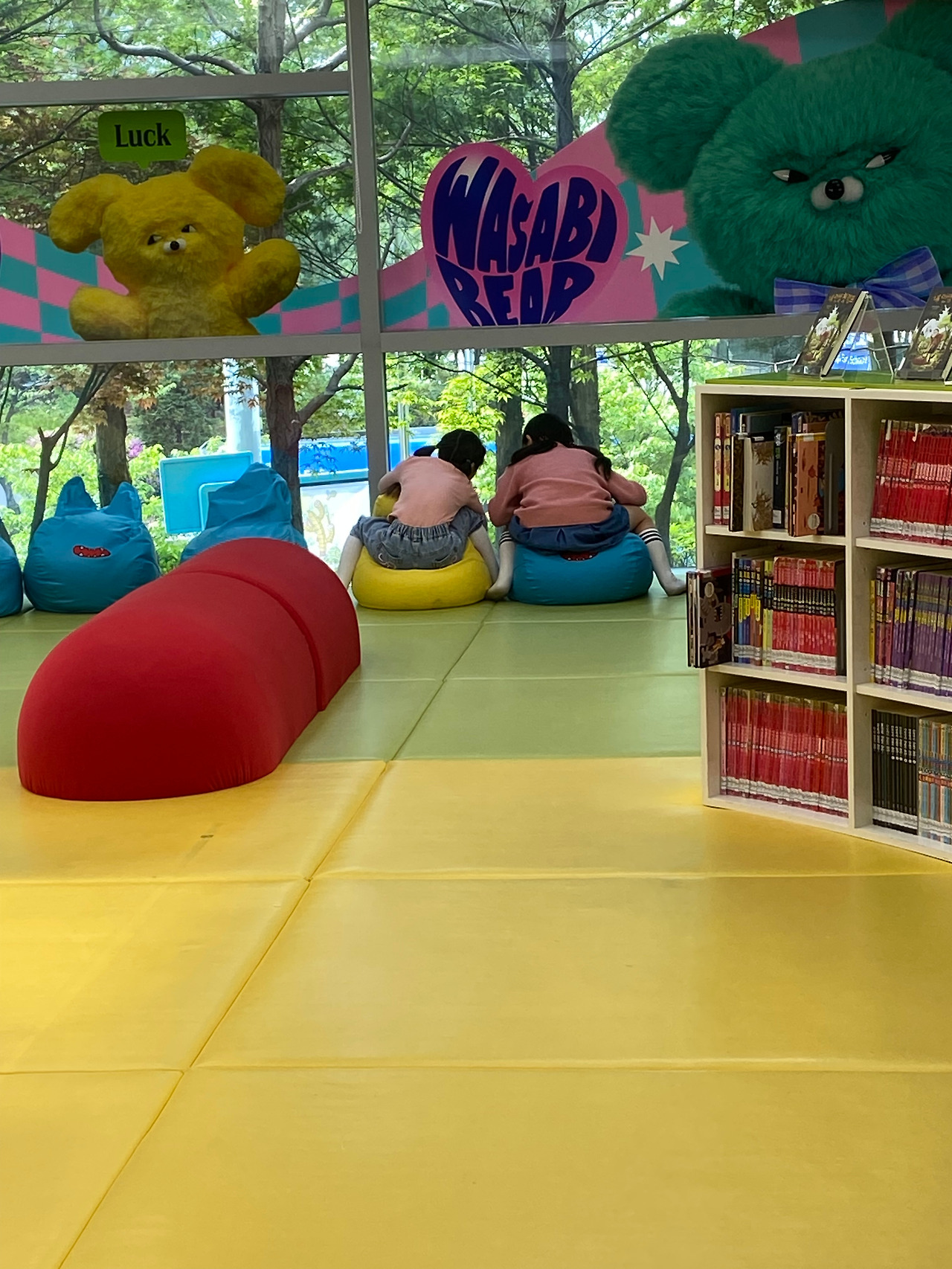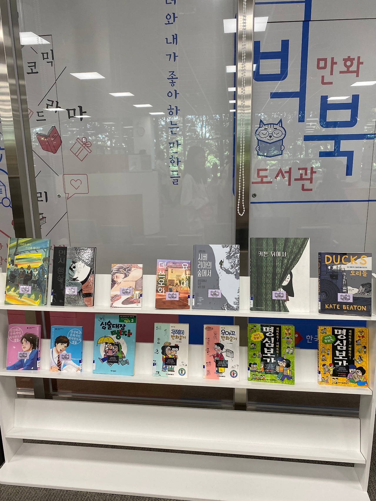 결국 알록달록한 어린이실에 가 있겠다고 해서 입구까지 데려다주고 나중에 살짝 들여다보니 그새 친구를 사귀어서 둘이 대화 중이었다. 그 덕에 나도 엉덩이 붙이고 내 취향의 만화를 고를 여유가 생겼다.
