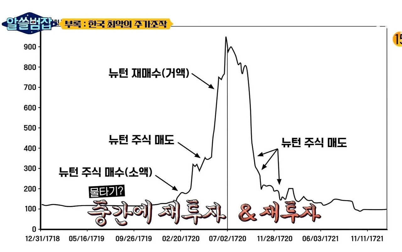 이렇게 글로만 쓰면 뉴턴의 실패가 잘 와닿지 않을 것 같아 관련 사진을 찾다가 프로그램 <알쓸범잡>에서 정리한 그래프를 찾았다. 아마 이 그래프를 보면 잠시 뉴턴의 속 쓰림에 공감할 수 있을지도 모른다.