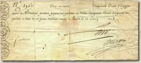 "은행은 소지자에게 요구 시, 오늘 날짜의 중량과 순도에 따른 은화(espèces) 50에쿠를 지급할 것을 약속한다. 1718년 6월 10일 파리에서 가치를 수령함"이라고 기재되어 있다.