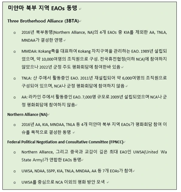 10월 27일, 미얀마 북부 중국 국경지역 일원에서 활동 중인 소수민족무장조직(Ethnic Armed Organizations, 이하 EAOs) 중 MNDAA (Myanmar National Democratic Alliance Army), TNLA (Ta’ang National Liberation Army), AA(Arakan Army)으로 구성된 Three Brotherhood Alliance (이하 3BHA)가 ‘1027 작전’개시를 선언했다.