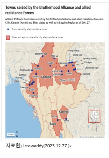 12월 초 중국 정부는 군정과 북부국경지역 3개 EAOs 간의 대화를 중재하고 12월 31일까지 ‘임시 휴전’에 합의했다고 밝힌 바 있다. 그러나 MNDAA는 군부의 지원을 받는 국경수비대 관할로 도박, 매춘, 온라인 사기로 악명 높은 Laukkai 타운십 탈환을 다짐하며 공세를 이어가고 있고, TNLA도 최근 며칠 동안 두 개의 타운십을 더 점령했다고 주장하는 등 샨 주 국경 지역에서 충돌이 계속되고 있다. 즉, 군정과 북부지역 3개 EAOs간 협상 와중에도 TNLA는 12월 15일과 19일 양일간 북부 Shan 주 Namhsan과 Mantong 타운십을 장악했고, 역시 북부 Shan 주 Namtu, Laukkai, Kutkai 타운십에 위치한 군부 기지도 EOOs의 공세에 수세에 몰리고 있는 것으로 알려졌다.