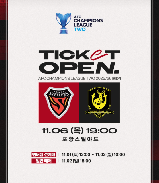 포항 ACL2 홈경기 축구 중계 11월 6일 포항 스틸러스 탬피니스 로버스 FC 경기일정 순위