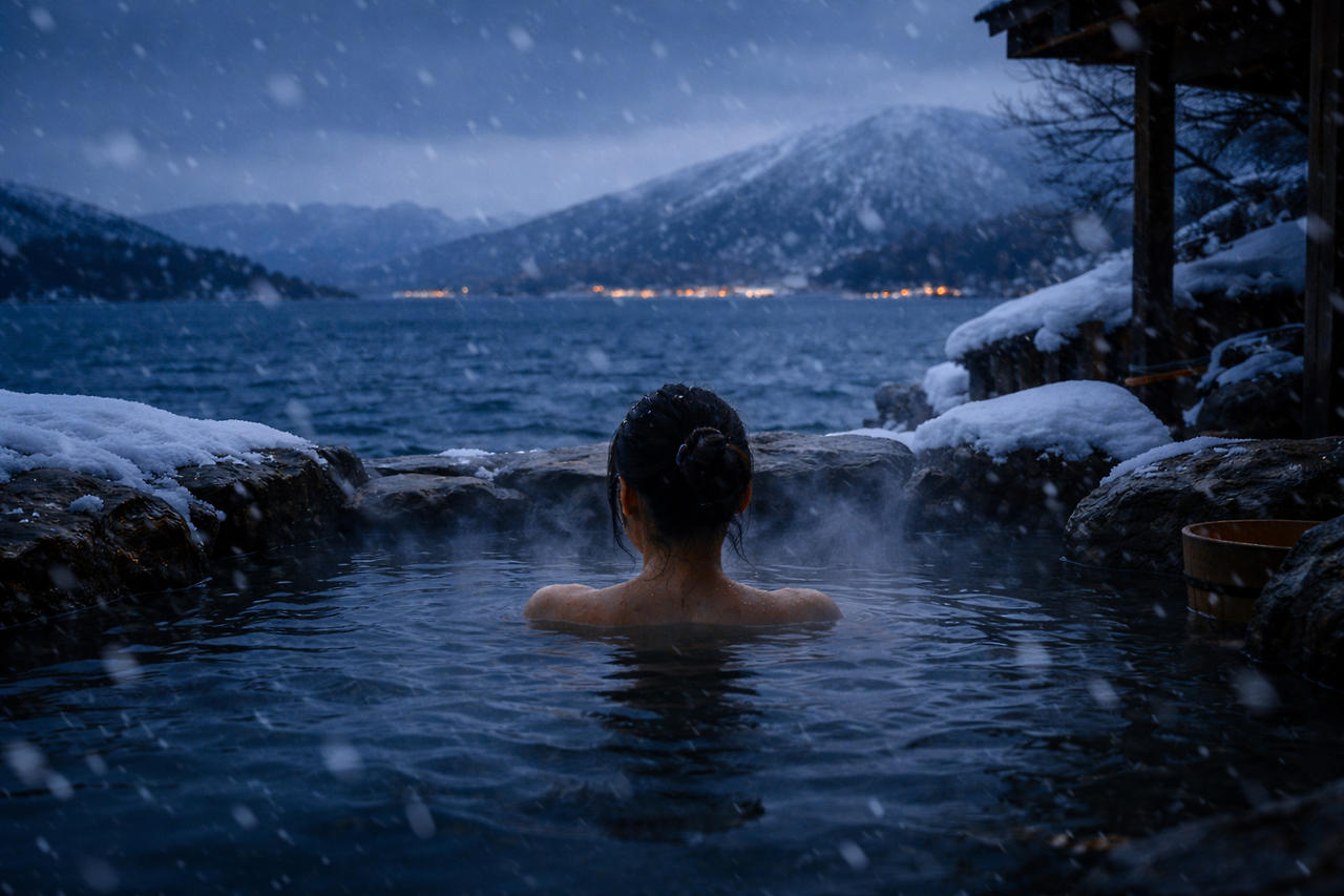 노천탕 너머로 검푸른 도야 호수의 물결이
