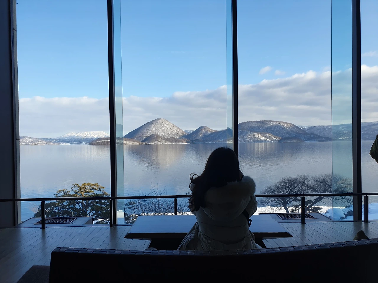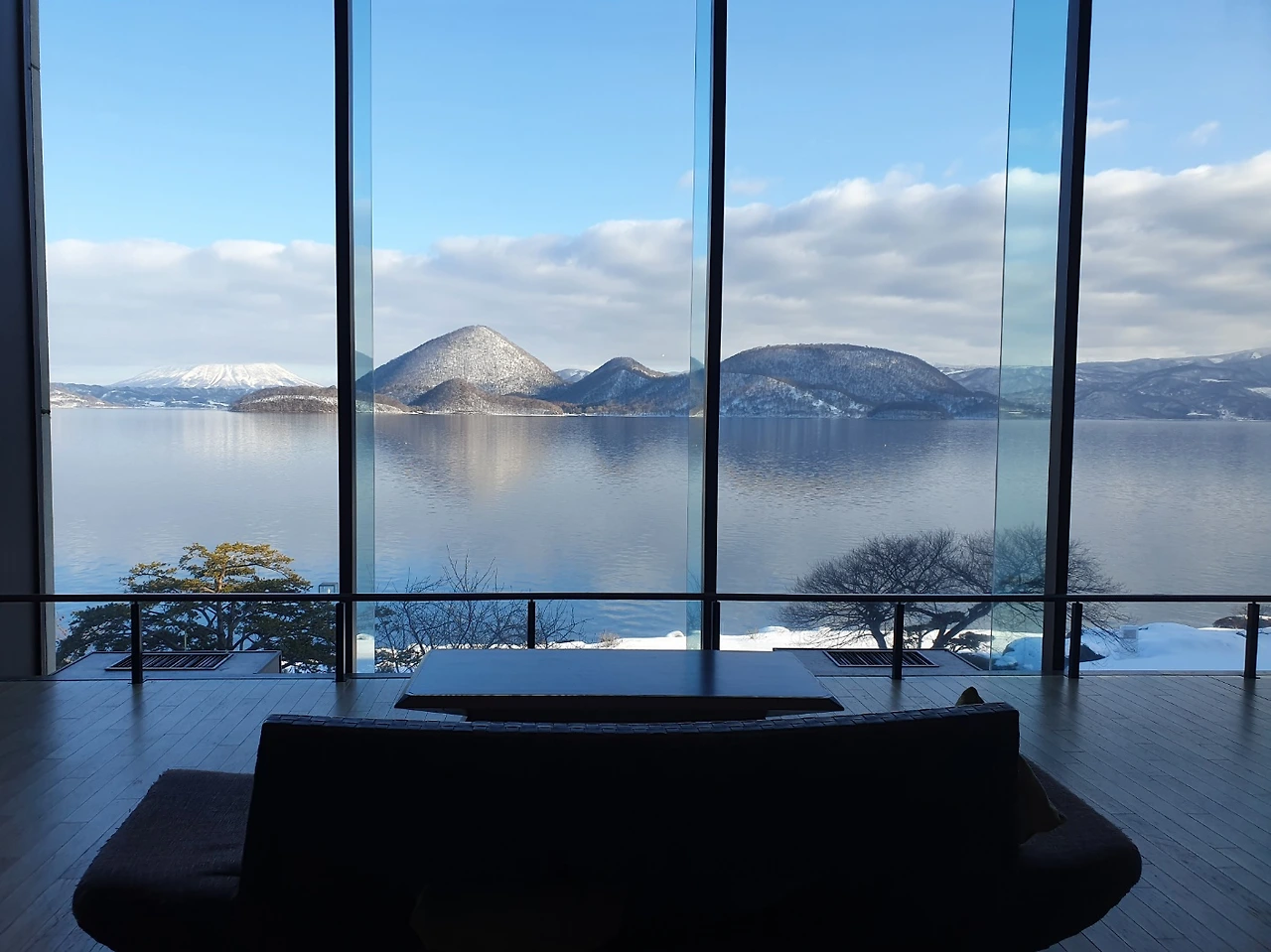 로비에서 바라보이는 도야 호수 그리고 리틀 후지산