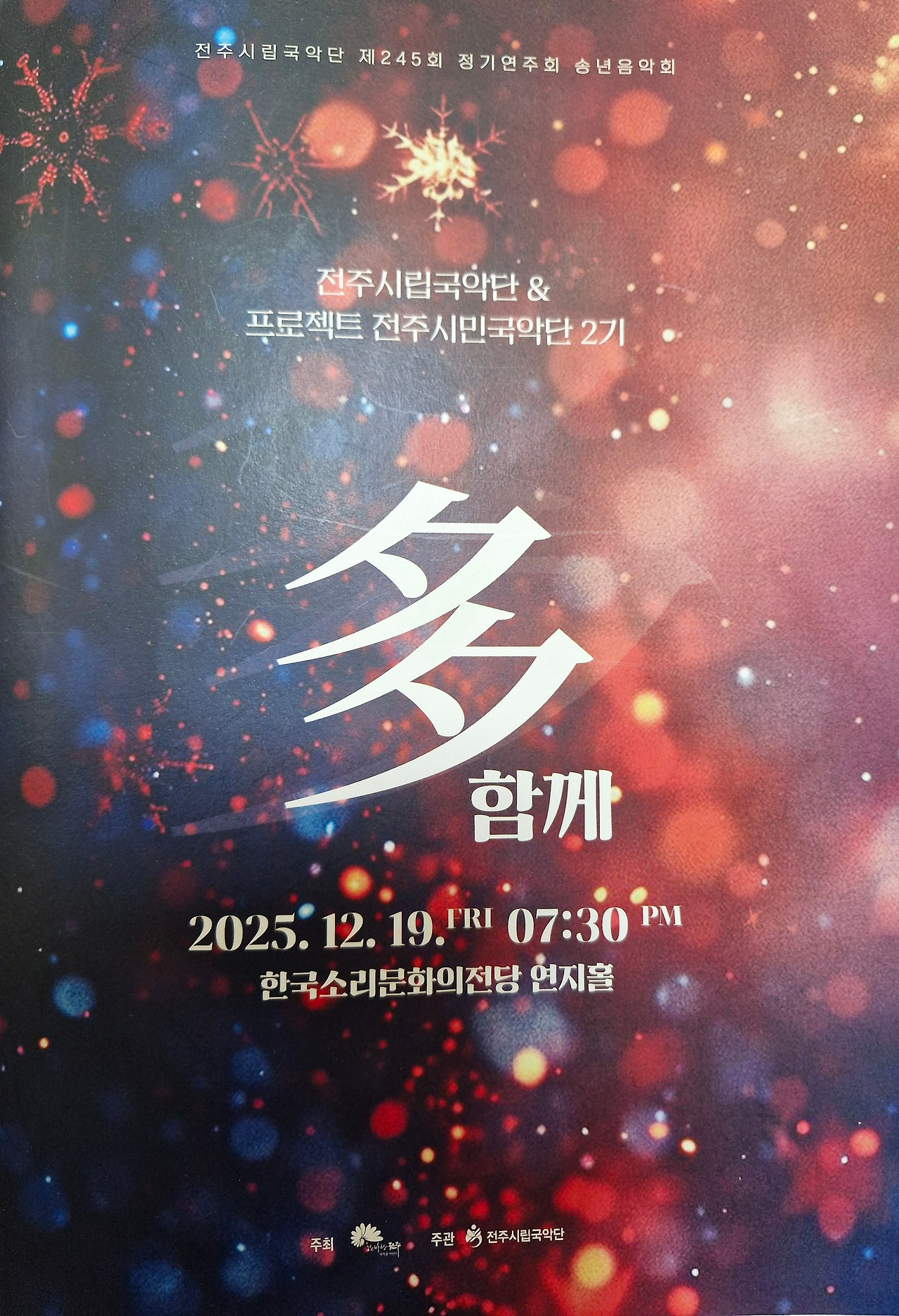 전주의 ‘한국소리문화의 전당’에서는 정기연주와 송년을 기념하는 음악회를 ‘전주시립국악단’과 ‘전주시민국악단’의 합주로 개최했다.