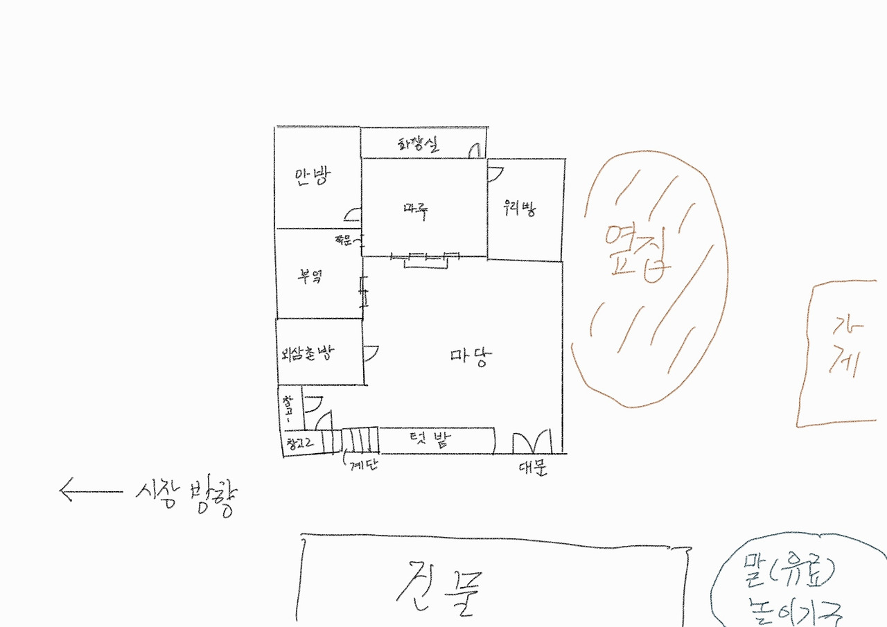 어린 나에겐 넓게 느껴졌던 회색빛의 시멘트로 미장된 마당에는 외할머니 감성으로 가득한 텃밭이 담장 쪽에 있었다. 텃밭에는 여러 작물을 키우셨는데 길쭉한 호박이 지지대를 휘감아 벽을 타고 지붕까지 이룰 정도로 넓게 퍼져있고 마당 곳곳에 선인장류의 크고 작은 화분들이 많았다. 텃밭 끝으로는 실외 화장실로 사용 중이거나 리모델링을 거쳐 창고로 쓰였을 것으로 추정되는 작은 공간이 있었고 그 공간 위로 옥상에 오르는 계단이 위치했다.