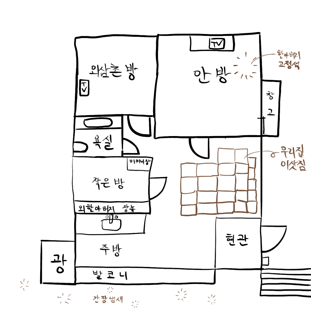 간석동에 위치한 문화연립(‘문화주택’이란 이름으로 아직도 있음!) B동 1층 끄트머리 집 거실은 우리 집 짐으로 가득 차 한 사람만 간신히 지나다닐 수 있는 복도로 탈바꿈되었다. 방 세 개의 이 집에는 이미 외조부모와 작은 외삼촌이 살고 계셨고, 그중 가장 작은 방을 우리 가족이 사용하게 됐다. 엄마 입장에선 친정 찬스를 200% 활용하는 셈인데 이렇게 수개월을 신세 졌다. 이런 민폐가 또 있을까 싶다.