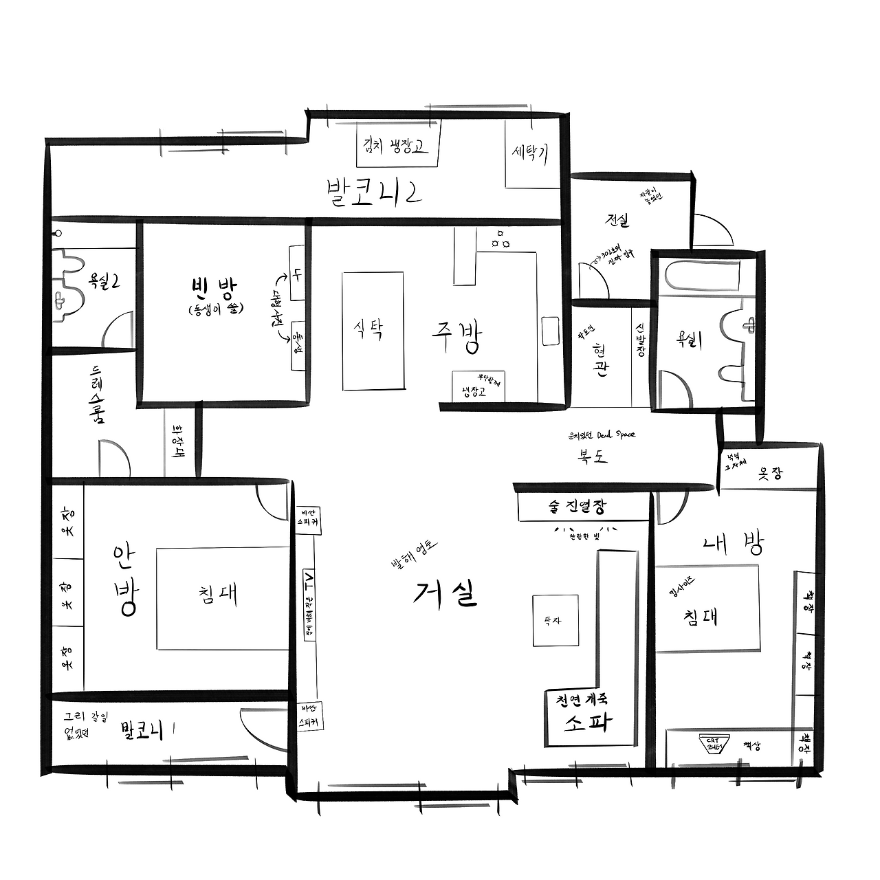우리 집은 내가 의무 경찰로 열심히 일하는 동안 아무런 기별 없이 인천 작전 1차 현대 아파트에서 부천 상동 진달래 마을 2243동 302호로 이사했다. 44평형으로 공간도 역대급이었지만 사소한 마감재부터 기존의 집 보다 모든 면에서 고급 져 보였다. 방은 4개 있었는데 작은방 1개는 벽을 허무는 인테리어 시공까지 해두어 지나치게 광활한 거실엔 못 보던 밝은 베이지 톤의 천연 가죽 소파가 놓여 있다. 그 옆으로 술 한 방울 못하는 우리 가족과 어울리지 않게 진귀한 양주병들이 진열되었는데 이것들은 아빠의 평생직장 생활 동안 가진 해외출장 기회 때마다 기념품 수집하듯 한 병씩 구입해 온 것이다. 형형색색의 이름 모를 양주병들은 진열장 앞 COB 조명을 저마다의 각도로 반사시켜 그 공간을 더욱 눈부시도록 화려하게 만들었다.