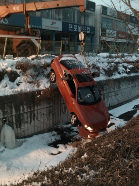하는 수없이 기울어진 차에서 어렵게 내려 하천의 살얼음을 조심스레 딛고 약 5m가량의 눈 덮인 둔덕을 암벽등반하듯 올라와 보험사에 사고 접수를 했다. 나의 빨간 애마가 아직 눈에 불을 켜고 있는데 턱이 망가진 듯 구겨지고 깨진 범퍼 때문에 너무 마음이 아팠다. 차를 인양하기 위한 크레인과 레카차까지 불러 적잖은 현금을 지불했고 인근 공업사에 맡겨진 차량 수리비 견적은 육백만 원을 상회했다. 차 값이 천만 원이었고 비싼 보험료를 아껴보겠다며 자기 차량손해 담보를 설정하지 않은 상태라 그냥 폐차하는 쪽으로 결정을 내렸다.