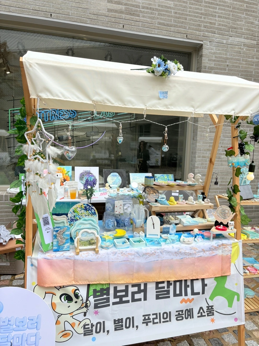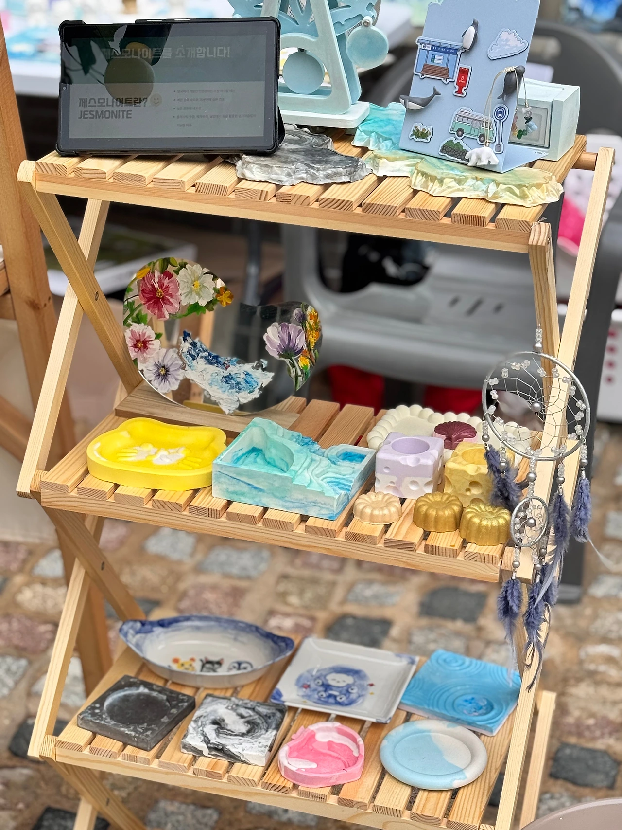 아침에 눈을 뜨니 빗방울이 창문을 두드리는 소리가 들렸습니다. 일기예보를 보며 마음 졸였던 불안감이 현실이 되는 순간이었죠. 혹시라도 비 때문에 발길이 끊기지는 않을까, 애써 만든 작품들이 가다가 깨지진 않을까 나무 진열대가 빗물 때문에 상하진 않을까 걱정이 앞섰습니다. 하지만 비가 온다는 소식에도 멈출 수 없었던 건, 처음으로 제 작품들을 세상에 선보이는 날이라는 사실 때문이었습니다.