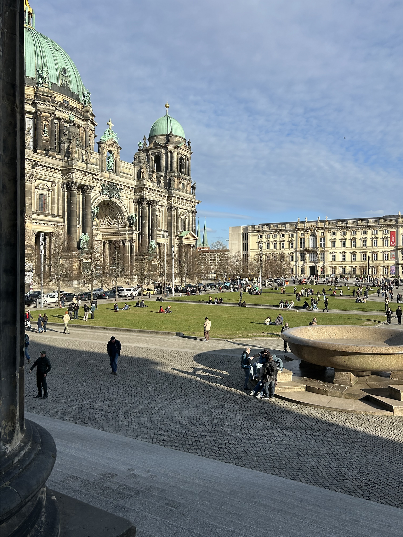 베를린의 어느 광장 앞에 주저 앉아 트럼펫 연주 소리를 들으며