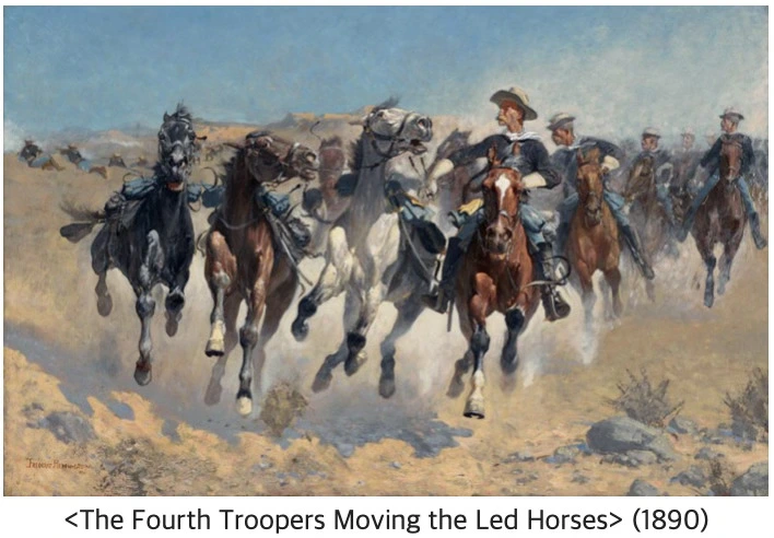 프레데릭 레밍턴의 1890년작 <The Fourth Troopers Moving the Led Horses>에서도 알 수 있듯, 프리데릭 레밍턴이 서부 시대를 작품에 녹여내는 과정에서 미국 개척대의 용맹함과 남성성이 강조된다. 또한, 미국 서부의 낭만적인 이미지를 통해 감상자들로 하여금 미국의 영광스러운 서부 개척 시대의 모험을 생생하게 체험할 수 있게 한다. 흔히, 프레데릭 레밍턴의 작품의 매력은 카우보이들의 힘, 공격성을 중심으로 미국 서부 개척 시대의 모험과 영광을 찬미하는 데 있다. 그러나 <퍼스트 카우>를 감상한 후, 프레데릭 레밍턴의 작품을 다시 살펴보면, 켈리 라이카트 감독이 참고하고자 했던 이미지들은 오히려 그의 후기 작품에서 더욱 두드러진다는 점을 알 수 있다.