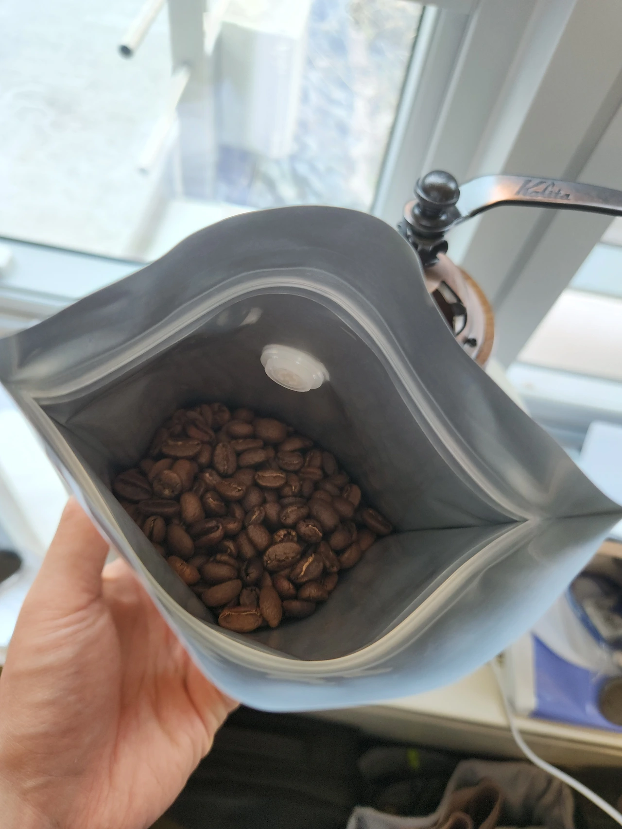 그라인더에 꽉 채운 원두를 갈아내는 것은 상당히 매력적이다. 원두를 박살 내버리는 데에서 오는 쾌감과 코를 찔러오는 고소한 내음, 이러한 감각을 느끼며 나누는 담소