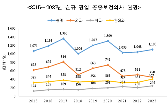 또한 매년 개선되는 현역병의 처우에 비해 군의관 혹은 공중보건 의사의 처우는 개선되지 않으니 남자 의사들 중 현역병으로 이탈하는 숫자가 매년 증가하고 있다.