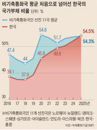 월요일 오전 경제신문을 읽다가 이상한 기사를 발견했다. 5월 11일 IMF가 「재정점검보고서」(Fiscal Monitor)를 발간했는데, 한국의 국가부채 비율이 사상 처음으로 非기축 통화국의 평균을 넘어선다는 것이었다. 다른 유력 일간지에도 비슷한 내용이 실렸다. 1면에서 비중 있게 다룬 주요 신문도 있고, 아래와 같이 이해하기 쉬운 그림과 함께 기사를 내보낸 신문도 있었다.