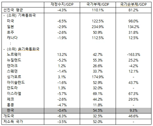 짜맞추기식 억지 뉴스였다. 일단, 출처가 된 IMF의 「재정점검보고서」(Fiscal Monitor)는 5월 11일이 아니라 약 3주 전인 4월 23일에 발간된 것이었다. 이 자료에는 선진국과 개도국, 저소득 국가 등을 구분하고 각각의 재정 건전성 지표가 나온다. 하지만, 기축통화국과 비기축통화국으로 구분한 내용은 없었다.