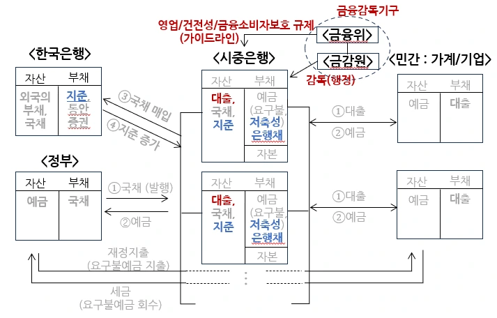 돈은 곧 차용증(=> 4/29, “부채이론” 참조)이라는 관점에서 위 글에 대해 몇 가지 문제를 제기하고 싶다. 첫째, 은행이 대출하지 않으면 한국은행이 본원통화(≒지급준비금)를 늘려도 시중에 돈은 풀리지 않는다. 은행대출이 늘고 그로 인해 은행의 차용증인 은행예금이 늘어나야, 그다음 차례로서 은행들이 적립하는 지급준비금(본원통화)이 늘어난다. 인과관계가 반대 방향이다.