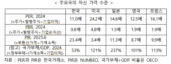 지표상 기업의 이익 창출에 대한 기대도 크지 않다. 예컨대, PER은 기업 이익 기준으로, PBR은 기업의 순자산 기준으로 평가한 주식의 가치인데, 아래 표에서 보듯이 국내 거래소 상장기업의 PER과 PBR은 2024년 기준 11.0배와 0.8배로서 다른 나라에 비해 매우 낮다. PER과 PBR이 낮은 것은 기업의 법률상 주인(주주)과 대리인(경영인) 사이에 정보 비대칭성과 도덕적 해이가 크다는 의미일 수 있지만, 주식 투자자들이 한국 기업의 미래 가치와 기대 이익을 낮게 평가하기 때문일 수도 있다.