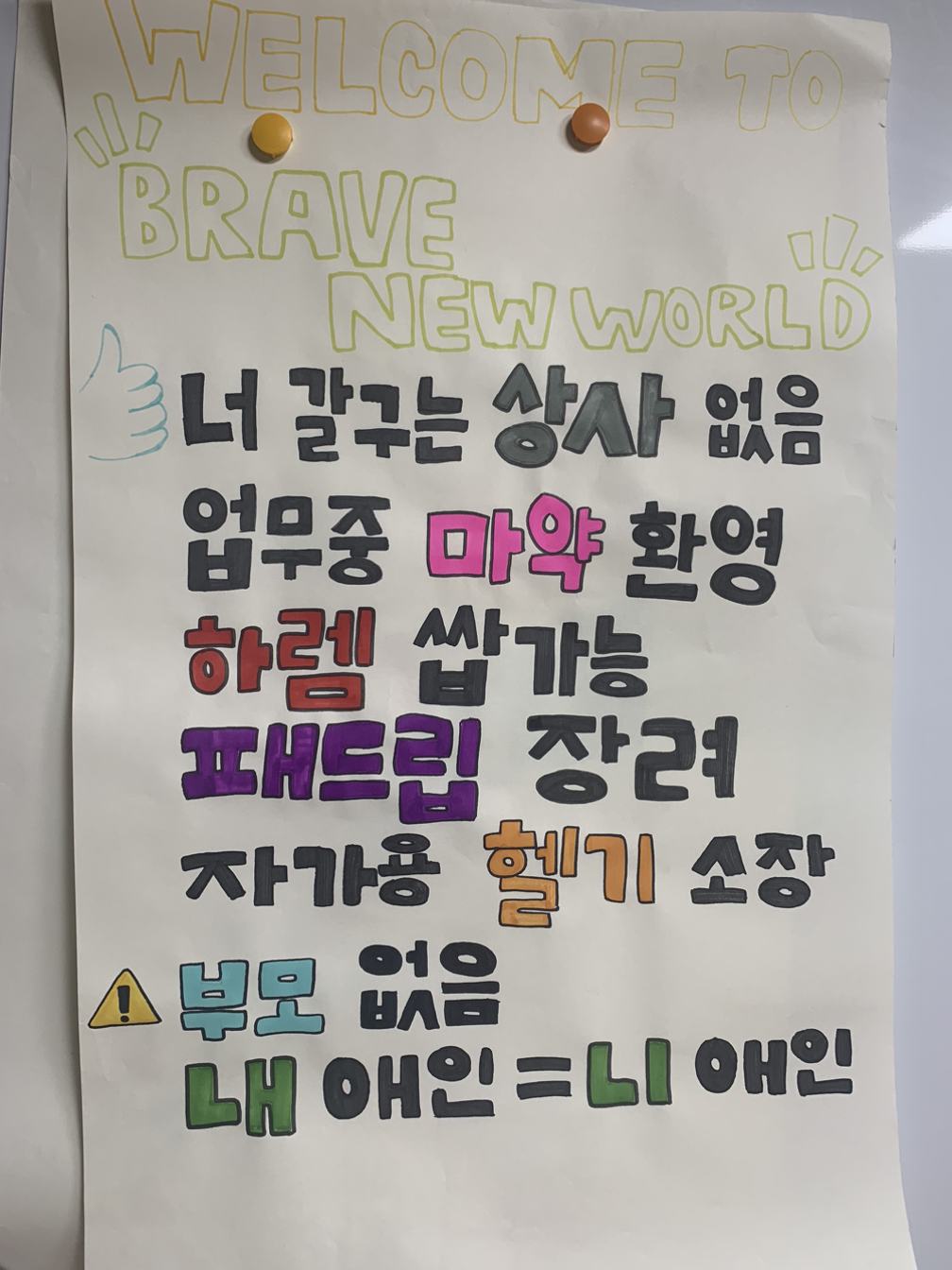 일단, 정보 파악하는데 2회차 이상의 수업이 필요하다. 그중 한 번은 소설 속 세계를 홍보하는 홍보대행사가 되어 이 세계를 소개하는 포스터를 만들어보는 수업을 한다. 아이들이 단연 좋아하는 수업이고, 열심히 하는 수업이다.