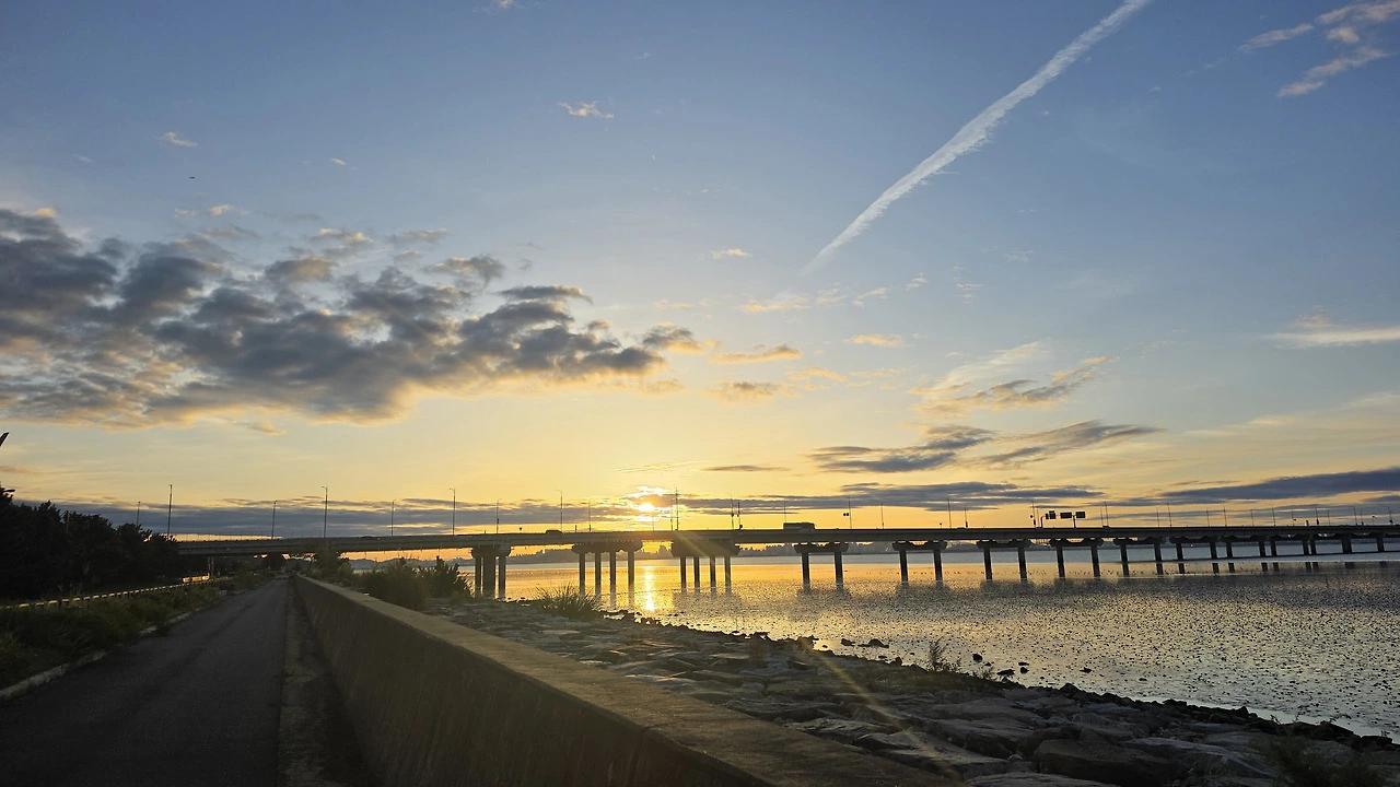 해가 뜨는 아름다움 위 바다를 가로지르는 다리, 저 직선은 목표에 닿게 만들고 빠르게 도달하게 만들지만 그 길 옆에 사람을 기다려 주지 못한다.