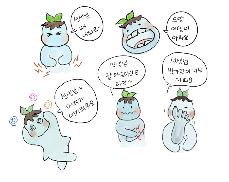 선생님… 여기도, 저기도, 요기도 아파요… 아파요… 아파요… 아프다고요….