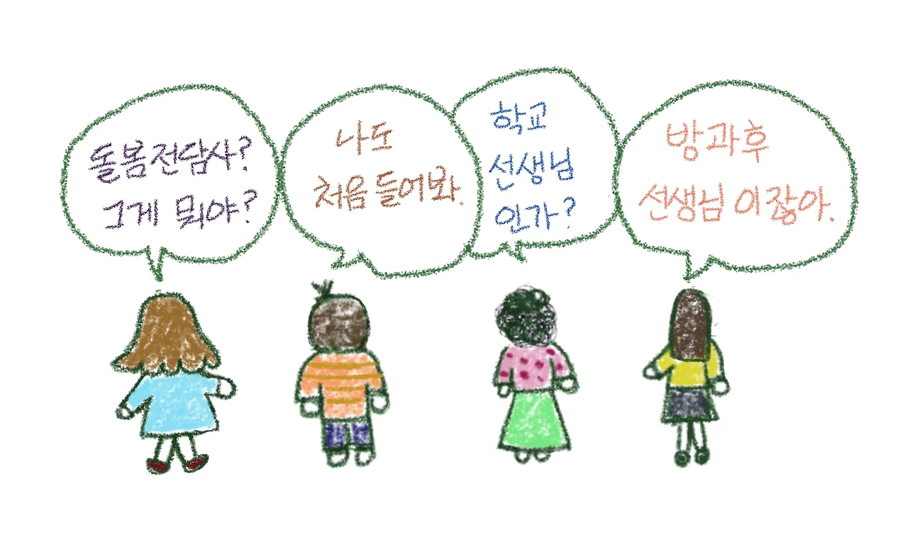 학교에서는 근무하는 모든 교직원에게 선생님이라는 칭호를 사용합니다. 교사도, 조리사도, 실무사도 선생님으로 부르죠. 돌봄 전담사 역시 학교에 근무하기에 선생님이라 불릴 수 있습니다. 하지만 교사는 아니랍니다.