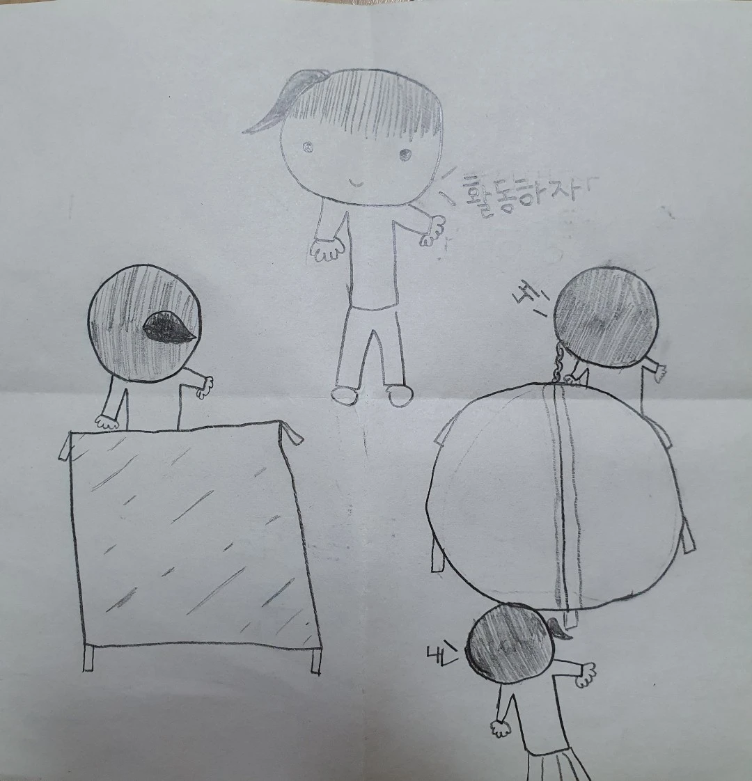 그림 속 “활동하자.”라고 쓰여 있는 글이 눈에 들어왔습니다. 그 문장을 보고 얼마나 웃었는지 모릅니다. 아이가 그려준 내 모습은 묘하게 나랑 많이 닮은 것 같아요. 지금은 아주 많이 자라 더 이상 돌봄 교실이 필요 없게 된 아이지요. 아주 이쁘고 사랑스러웠던 그 아이가 이 그림을 기억할까요?