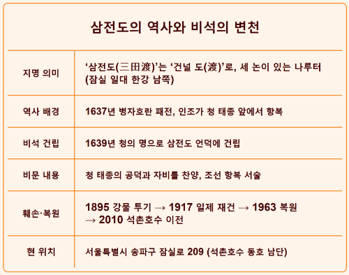 ‘삼전도’라는 이름을 처음 들으면 어딘가 섬 같지만, 사실 ‘도(渡)’는 ‘섬(島)’이 아니라 ‘건널 도(渡)’이다. 즉, 삼전도는 세 개의 논이 있는 나루터, 지금의 잠실 일대에 있던 한강 남쪽 나루였다.