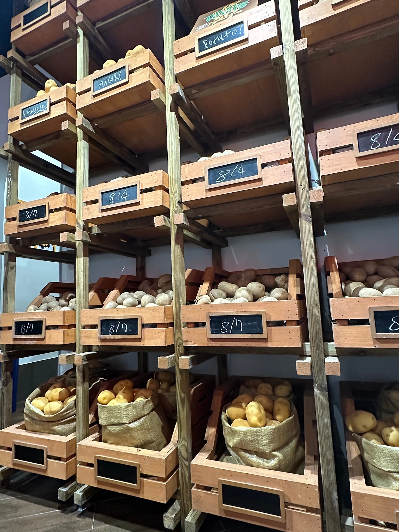 가게 들어서자마자 정면에 보이는 선반에는 나무 상자 안에 감자들이 예쁘게 놓여있다. 처음에는 모형인 줄 알았으나 상자 앞에 날짜가 쓰여있다. 다 일주일 이내의 아주 신선하고 알 큰 감자들이었다. 눈으로 확인된 신선도! 굿!!!