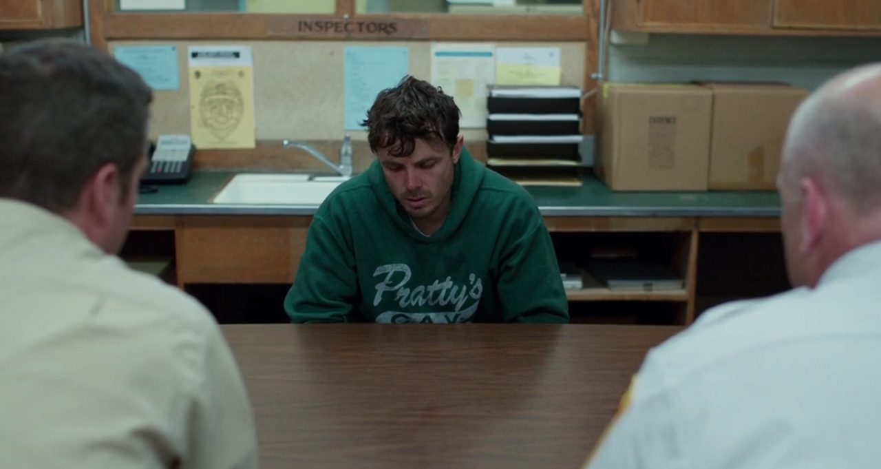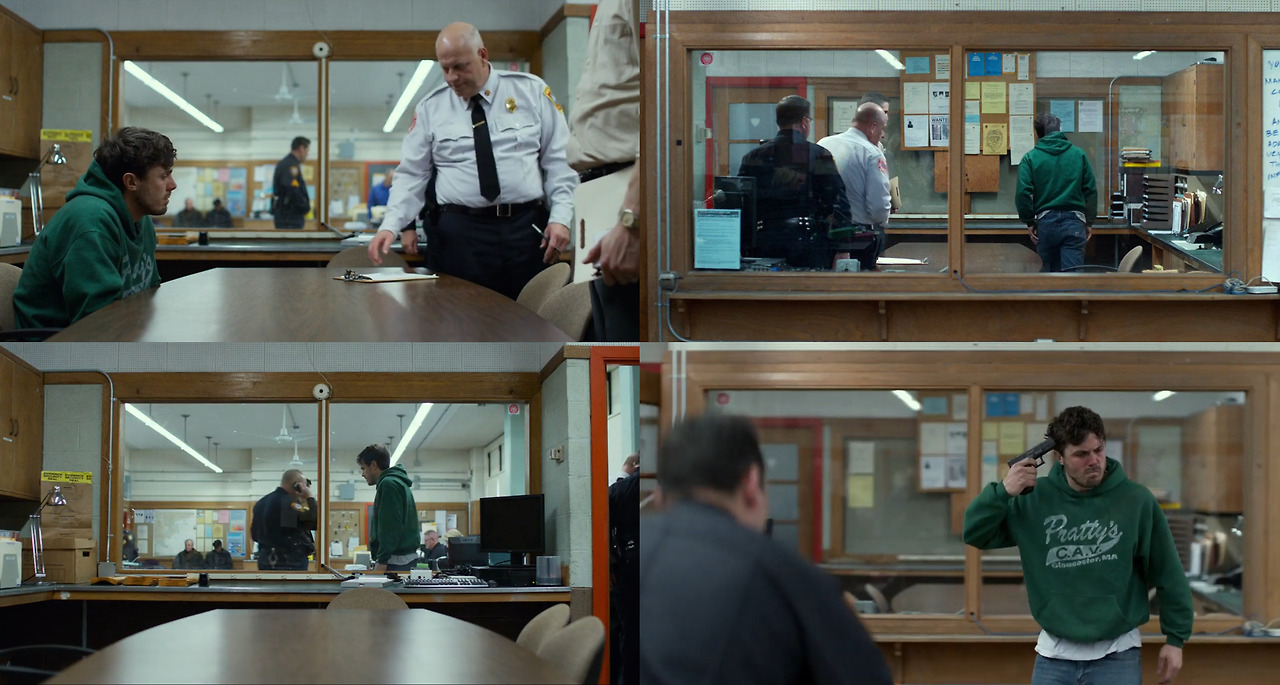 경찰서로 장면은 전환됩니다. 리는 밤새 있었던 자초지종을 경찰에게 설명합니다. 그 자리에 있지도 않았던 마약까지 언급하며 리는 자신의 잘못을 역설합니다. 그러나 경찰은 그를 체포하지 않습니다. 안전망을 깜빡한 건 법적으로 죄가 아니기 때문입니다. 리는 취조실을 걸어 나오자마자 지나가는 경찰의 허리춤에서 권총을 빼들고 자신에 머리에 겨눕니다. 안전장치가 걸려있어 자살은 실패하고 곧바로 경찰에게 제압당합니다. 케이시 애플렉의 "제발요.."라는 애드리브가 돋보이는 장면입니다.