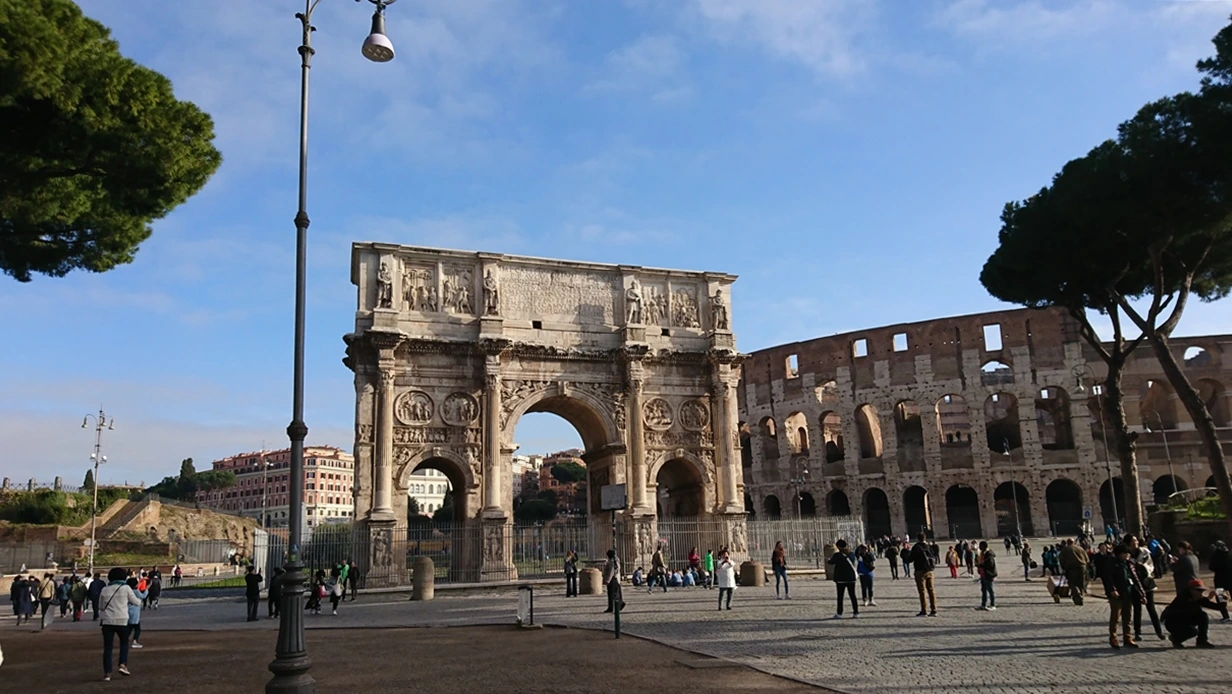 콜로세움과 콘스탄티누스 개선문은 한 공간에서 바라볼 수 있어 더 조화롭다. 콘스탄티누스 개선문 바로 앞에 콜로세움이 있고, 개선문 후면을 바라보고 서서, 우측으로 고개를 돌리면, 조금 떨어진 곳에 팔라티노 언덕으로 오르는 길이 보인다. 그 길 끝에 티투스 개선문이 승리에 취한 듯 우뚝 서 있다.